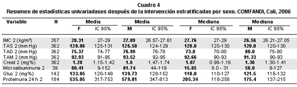 En microalbuminuria, aunque los valores de la media y mediana fueron menores después de la intervención, globalmente no mostró que generara una disminución importante (p=0.15), hallazgo que se mantiene igual al estratificar por género y grupo de edad.