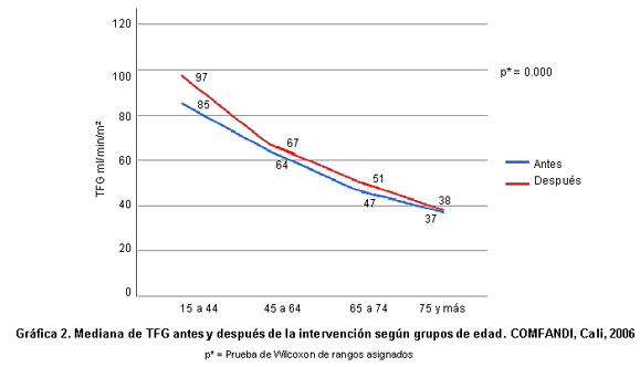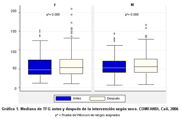 En la variable resultado la tasa de filtración glomerular aumentó del tiempo 1 al tiempo 2 con una mediana antes de la intervención de 52 ml/min/m2 y después de 55 ml/min/m2, que fue significante (p=0.000). Al estratificar por sexo las diferencias siguen siendo significantes entre un tiempo y otro (femenino p=0.000) (masculino p=0.000) (Gráfica 1). Se encontraron resultados similares en cuanto a significancia estadística al estratificar por grupo de edad con mayores diferencias en la mediana en el grupo de 15 a 44 años (Gráfica 2).