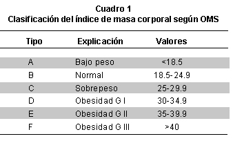 Las investigadoras, que antes habían sido entrenadas en el Departamento de Nutrición de la Universidad del Valle, y con previa calibración de los instrumentos de medida, tomaron las medidas antropométricas directamente. El peso se puede relacionar con la talla mediante el índice de masa corporal (IMC) o índice de Quetelet30, que se obtiene al dividir el peso en kilogramos entre la talla en metros al cuadrado IMC = peso (kg)/talla (m2). En este trabajo se utilizó la clasificación del IMC de la Organización Mundial de la Salud (OMS) (Cuadro 1) y aunque el IMC es una medida indirecta de adiposidad, es el método más utilizado para calibrar la obesidad.