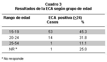 Resultados obtenidos en la ECA. A partir de los resultados de la aplicación de la encuesta, se determinó el porcentaje de ECA con puntaje positivo. Del grupo total de estudio la puntuación promedio en la ECA fue 23. 37 con una DE 9.81 y un rango de 7 a 65; la puntuación promedio en la ECA para las mujeres fue 26. 6 con un rango de puntuación de 9 a 65, y para los hombres el promedio fue 19. 6 con un rango de 7 a 40. En el filtro realizado, el porcentaje de participantes con ECA positiva (puntaje >24) fue 39.7% (69 estudiantes). El grupo de edad entre 15 a 19 años tuvo la mayor proporción de personas con ECA positiva: 45.3% (Cuadro 3).