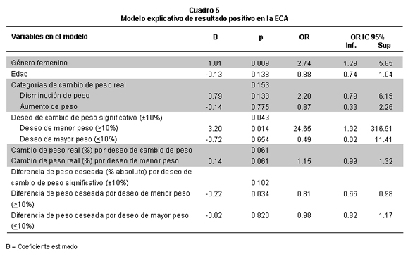 Se realizó un análisis de regresión logística para establecer las variables asociadas con una puntuación positiva en la ECA. El modelo explicativo final se observa en el Cuadro 5. Este modelo presenta las razones de oportunidad (OR) de obtener una puntuación positiva en la ECA ajustadas por las otras variables del modelo. Se encontraron OR significativas para el género femenino (OR: 2. 74 IC95%: 1.3%-5.8%), para el deseo de disminución de peso significativo, mayor a 10% (OR: 24.65 IC95%: 1.9%- 316.9%) y para la interacción entre el deseo de disminución de peso mayor a 10% y la diferencia porcentual de peso deseada, expresada como su valor absoluto (OR: 0.81 IC95%: 0.6%-0.9%). Otras variables incluidas en el modelo fueron: edad, categorías de cambio de peso en el último año (aumento, disminución), deseo de mayor peso y deseo de cambio significativo de peso (mayor a 10% del peso actual). Las siguientes variables se consideraron en la regresión, pero no se las incluyó en el modelo: IMC, categorías del IMC y cambio significativo de peso en el último año (mayor a 10%).