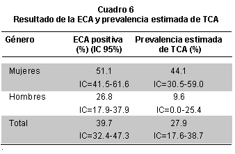 También se estimó la prevalencia de los TCA a partir de la ECA, según la fórmula de Karaagaoglu explicada en los materiales y métodos23. Para estimar la prevalencia de los TCA, se tienen en cuenta la sensibilidad (90.5%) y la especificidad (80%) de la ECA. Estos resultados se observan en el Cuadro 6, obteniéndose una prevalencia estimada de TCA de 44.1% en mujeres y 9.6% en hombres, con una razón de prevalencias mujer/hombre de 4. 6.