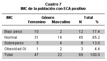 Por último, al evaluar el IMC de la población con ECA positivo se encontró que la mayoría estaba dentro del rango normal con 65.2%, mientras que 17.4% estaban en el rango de bajo peso (Cuadro 7)
