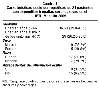Se hace un estudio descriptivo longitudinal de serie de casos, en 24 pacientes de la consulta externa del Hospital Pablo Tobón Uribe de la ciudad de Medellín, con diagnóstico reumatológico de espondiloartropatías seronegativas según los criterios establecidos por la Asociación Americana de Reumatogía, con factor reumatoideo negativo. El comité de ética médica del Hospital Pablo Tobón Uribe, analiza y autoriza la investigación. Los pacientes aceptan participar de forma voluntaria en el estudio y firman el consentimiento informado. Se excluyeron los individuos con enfermedades o procedimientos quirúrgicos que pudieran llevar a inflamación ocular o que no cumplían con los criterios de inclusión mencionados atrás. Se revisaron las historias clínicas de dónde se extrajeron los datos que el paciente corroboró en el momento de la evaluación.