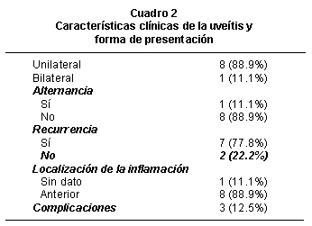 En 37.5%9 pacientes hubo historia de inflamación ocular que se comportó así: compromiso unilateral, en 88.9%8; y bilateral, en 11.1%1, no hubo alternancia de la inflamación en 88.9%8 y se presentó recurrencia en 77.8%7 pacientes (Cuadro 2). La localización de la inflamación fue anterior en 88.9% de los casos. En 12.5%3 hubo cataratas en 2 casos y sinequias en 1.