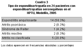 El tipo más común de espondiloartropatía fue la espondilitis anquilosante en 58.3% (14) enfermos; y después artritis no clasificada en 20.8%5 (Cuadro 3). Además, 12.5%3 tenían antecedentes familiares de espondiloartropatía. Apenas en 29.1%7 se efectuó el examen de HLA B27, que fue positivo en 71.4%5 de los 7 evaluados.