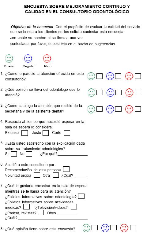 Dentro de las múltiples maneras que existen para evaluar los servicios están las encuestas. Ellas pueden dar una indicación de cómo ven los clientes, qué tan eficiente se es en la prestación del servicio, qué tan buen profesional lo ven a usted, cómo ve el cliente a su empresa y al final, si está satisfecho y si va a recomendar su consultorio. Las encuestas son pues una herramienta de gran valor para intentar medir la aceptación de la labor ejecutada.