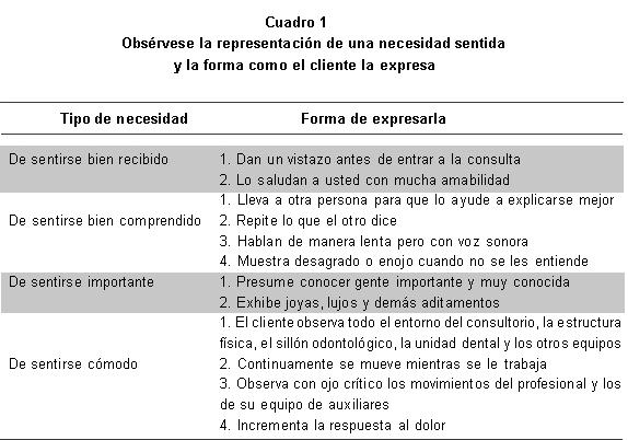 Entender las necesidades del cliente. En el consultorio odontológico se hace más palpable la necesidad de una actitud de comprensión de las necesidades de quienes acuden en busca de servicios de salud odontoestomatológica debido al grado de tensión con que llega el cliente. La gran mayoría de las veces, no la comunican con palabras pero sí utilizan un lenguaje muy particular que usted como profesional debe descifrar o conocer.