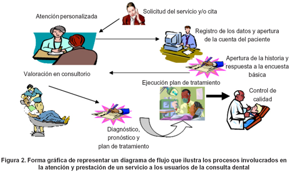 Se trata, entonces, de construir un mapa global de los procesos que desarrolla la organización como tal y un mapa conceptual de cada proceso específico1 aplicado por cada sección de la organización, a partir de y con fundamento en la estructura tradicional que percibe el cliente, para presentarlo en forma sintética como un diagrama de flujo; esta es una gestión con la que la administración de empresas contribuye a optimizar la gestión de calidad en la prestación de servicios de salud oral.