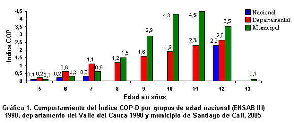 Este trabajo identifica la situación de las enfermedades más comunes en la cavidad oral de los escolares de Cali, que a nivel de países desarrollados ha mostrado una tendencia a la reducción, por los programas de fluorización y de higiene oral dirigidos a estos grupos poblacionales. Pese a que en Cali se han hecho múltiples esfuerzos por parte de la Secretaría de Salud Municipal para reducir los índices de caries y enfermedad periodontal se observa que en el grupo de 12 años el índice COP es 3.5, cuando en el ENSAB III se informó un valor de 1.7 para Cali, 2.3 para el nivel nacional, el estudio departamental de 2.65, ello indica que en este grupo de edad ha habido aumento en la historia de caries (Gráfica 1). Este valor es similar a los presentados en países como Ecuador (3) y las islas de San Vicente y Granadinas (3.2) en la región de las Américas6. A pesar de los esfuerzos a nivel municipal, las enfermedades de los dientes y estructuras de sostén siguen siendo las primeras causas de consulta externa, como lo informa Malambo7 para Bogotá.
