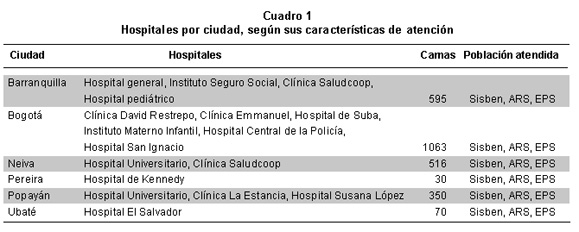 Se trata de un estudio piloto de observación de casos, en el que se captan todos los recién nacidos con bajo peso para la edad gestacional, según la definición de la Organización Mundial de la Salud (OMS), menores de 2,500g para 40 semanas de gestación. La población de estudio se estableció por conveniencia, para tener representación de varias regiones de Colombia. Se escogieron 17 instituciones prestadoras de servicios de salud, en Barranquilla, Bogotá, Neiva, Pereira, Popayán y Ubaté, con la colaboración del Laboratorio de Salud Pública Departamental (Cuadro 1). Los requisitos de selección de estos hospitales fueron que tuvieran en promedio por lo menos un parto diario, que contaran con servicio de laboratorio clínico y que hubiera compromiso de la gerencia. La captación del niño con bajo peso o con anomalías, implicó tomar muestras para exámenes y los cuidados dentro de su plan de atención en salud, contemplados en el consentimiento informado al ingreso hospitalario, con las consideraciones éticas correspondientes.