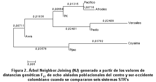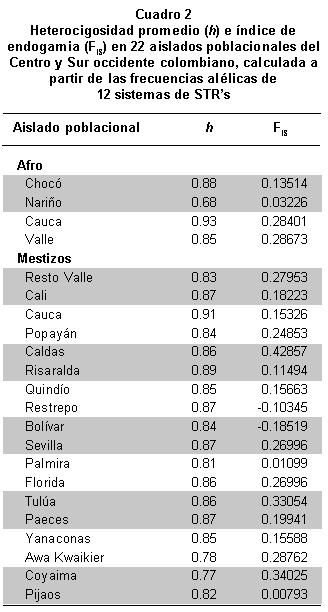 El análisis de la endogamia presente en los 22 aislados poblacionales mostró valores positivos inferiores a 43%, excepto en los aislados de Restrepo y Bolívar (Valle) lo que indica apareamientos preferenciales entre individuos heterocigotos en estas poblaciones (Cuadro 2). Estos resultados podrían estar siendo influidos por los bajos tamaños de la muestra en algunas poblacionales.
