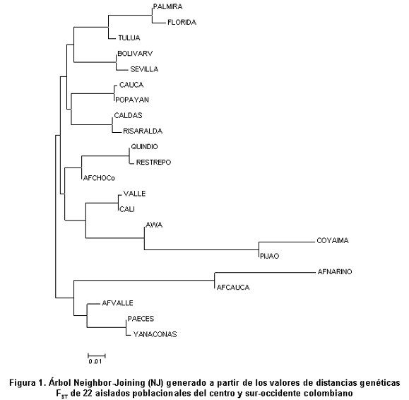Basado en las parejas de distancias genéticas FST de los 12 sistemas estudiados para cada uno de los grupos poblacionales muestriados, se realizó un análisis de inferencia filogenética por el método de los vecinos cercanos o Neighbor-Joining (NJ) en el software Mega 3.124 (Figura 1). El árbol mostró una relación, de manera acentuada, entre las muestras afrodescendientes de Nariño, Cauca y Valle con las muestras amerindias Paeces y Yanaconas. La población mestiza de Cali y del resto del Valle también presentó fuerte relación con el resto de las muestras indígenas analizadas, confirmando la observación realizada a partir de las distancias genéticas de los marcadores de mtDNA, en donde se establece la cercanía de estas comunidades con las muestras mestizas. Llama la atención el hecho de que las poblaciones del centro y norte del Valle se separan de Cali y el resto del Valle, en una misma agrupación junto con las muestras de Popayán y mestizos de Cauca, Risaralda y Caldas; este resultado es evidencia de la conectividad poblacional que existe entre comunidades del centro y del sur-occidente colombiano.