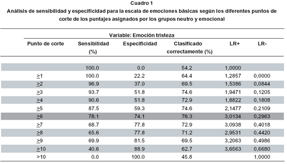Análisis de sensibilidad y especificidad. Para este análisis se asumió como condición de referencia las dos versiones de la prueba: la versión emocional (+) (n=32) y la versión neutra (-) (n=27). Frente a estas dos condiciones, se analizaron los puntajes de la escala de emociones básicas, el puntaje normalizado del cuestionario de reconocimiento en fase 2 (CRN-F2), y el promedio académico de los participantes. Según el Cuadro 1, se sugiere que el mejor punto de corte para la puntuación de la emoción tristeza está en un valor de 6, con lo que además se obtiene un valor predictivo positivo (VPP) de 78.1% y un valor predictivo negativo (VPN) de 74.1%. Esto indica que los participantes que atribuyeron un puntaje >6 a la emoción tristeza, se pueden clasificar con una confiabilidad de 78.1%, dentro de la versión con alertamiento emocional, mientras que los que atribuyeron puntajes <6, se pueden clasificar con un 74.1% de confiabilidad, dentro de la versión neutra.