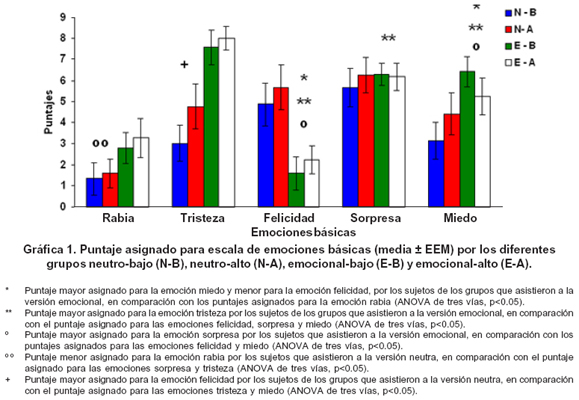 Análisis del valor emocional y las emociones básicas con altos y bajos niveles de ansiedad. El ANOVA de una vía, no reveló diferencias significativas entre los puntajes asignados a valor emocional por cada uno de los grupos participantes (p>0.05). Por otro lado, al analizar los puntajes asignados a la escala de emociones básicas por los diferentes grupos (ANOVA, tres factores: versión, grupo y emociones) (Gráfica 1), se encontró que existen diferencias significativas atribuibles a la «versión» (F[1,275]=5.636, p<0.018) y a los puntajes asignados a las emociones básicas (F[4,275]=14.805, p<0.001), pero no para los niveles de ansiedad (F[1,275] =1.731, p<0.189). Adicionalmente, se presentaron interacciones significativas entre factores (F[1,275]=1 0.567, p<0.001). De esta manera, se encontró que los participantes del grupo emocional (prueba t de Bonferroni) atribuyeron un valor más alto a las emociones miedo (t=5.758), sorpresa (t=4.0109) y tristeza (t=6.034); mientras que los participantes del grupo neutro asignaron un puntaje mayor a las emociones sorpresa (t=5.229) y felicidad (t=4.408).