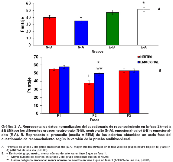 Análisis del recuerdo libre (RL) y el cuestionario de reconocimiento en fase 2 (CRN-F2). El ANOVA de una vía no mostró diferencias estadísticas entre los puntajes asignados en el RL por cada uno de los grupos (p>0.05). Por otra parte, al analizar los datos normalizados por número de preguntas de cada fase del CRN-F2 (ANOVA, una vía) (Gráfica 2), se encontró que existen diferencias significativas entre el grupo de participantes emocional-alto (H=13.287, p<0.004) quienes recordaron un mayor número de puntos de la historia en el CRN-F2 (prueba de Dunn’s), que los participantes de los grupos neutro-bajo (Q=2.668) y neutro-alto (Q=3.248). Entretanto el ANOVA de dos vías reveló diferencias significativas entre los grupos atribuibles a la «versión» (F[1,171]=8.470, p<0.004) y a las «fases» de la historia (F[2,171]=21.341, p<0.001), mostrando además una interacción entre estos dos factores (F[2,171]=4.585, p<0.011). De tal forma que los participantes del grupo emocional (prueba t de Bonferroni), recordaron más puntos de la historia en la fase 2 (t=4.084), que los adolescentes que conformaron el grupo neutro.