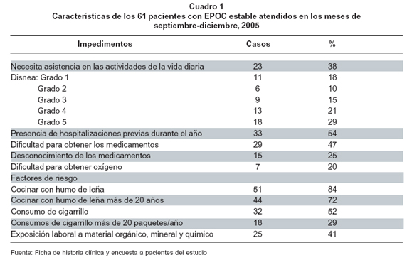 Resultados: Durante el período de estudio se atendieron por consulta externa en la institución 69 personas con diagnóstico primario de EPOC; de estos, 61 cumplían con los criterios de inclusión. La edad media del grupo fue 73 años y 70% eran mujeres; 50% tenía bajo nivel socioeconómico y ningún grado de escolaridad; 93% tenía dependencia económica de su familia. El mayor factor de riesgo, fue humo de leña (84%), con un promedio de exposición de 20 años; 30% recibió educación por parte del médico, 47% usaba broncodilatadores inhalados y 48% refería dificultades para conseguirlos. Sólo un paciente había asistido a rehabilitación pulmonar aunque 56% utilizaba oxígeno domiciliario y 93% presentaba algún grado de disnea.