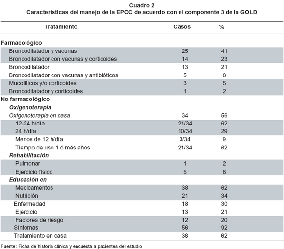Educación. La educación es una recomendación importante de la GOLD para el individuo con EPOC. Sin embargo, de los pacientes que asisten por consulta de neumología y medicina interna, 30% ha recibido educación acerca de su enfermedad, 20% en factores de riesgo, 21% en los beneficios del ejercicio físico y 34% en las recomendaciones nutricionales. No obstante, 62% ha obtenido instrucciones de su médico acerca del uso apropiado de los medicamentos y del tratamiento enviado a casa, y 92% reconoce los síntomas de empeoramiento (Cuadro 2).