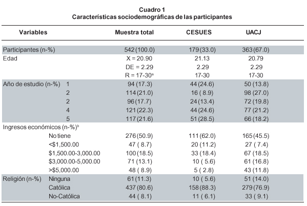 Los participantes que cumplieron con esos criterios fueron 1,489 (691 del CESUES y 798 de la UACJ), de los cuales para los propósitos de este estudio se seleccionaron únicamente a las mujeres que informaban tener experiencia sexual, por lo que la muestra definitiva quedó conformada por 542 estudiantes [179 (33.0%) pertenecientes a la primera institución y 363 (67.0%) a la segunda]. La edad promedio de la totalidad de las participantes fue 20.9 años (desviación estándar=2.29; edad mínima 17 años; edad máxima=30 años); las restantes características sociodemográficas de las participantes aparecen en el Cuadro 1.