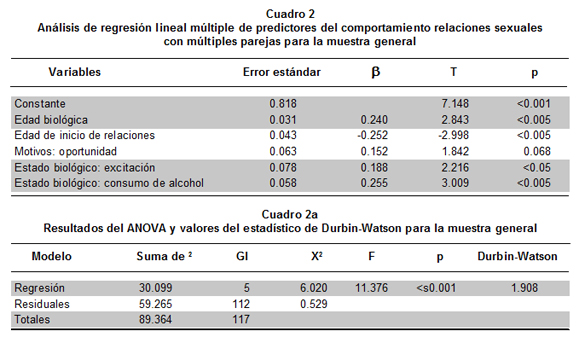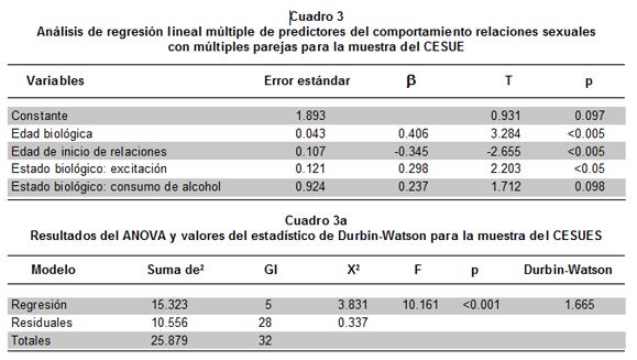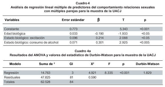 Al comparar el comportamiento con la prueba U de Mann-Whitney se encontró una diferencia significativa entre las participantes de ambas instituciones (U=29509.500; Z=-1.937; p<0.05), con un rango de X=254.86 y de 279.71 para las estudiantes del CESUES y de la UACJ, respectivamente; en tal sentido, las estudiantes pertenecientes a la segunda institución se habían relacionado con más parejas a lo largo de su vida sexual activa.Predictores del comportamiento «relaciones sexuales con múltiples parejas.En lo tocante al análisis de regresión lineal múltiple (método hacia atrás), los resultados generales fueron los siguientespara la totalidad de las participantes, los predictores del comportamiento fueron la edad biológica, la edad de inicio de relaciones y dos estados biológicos (me encontraba excitada y había consumido alcohol) (Cuadro 2).