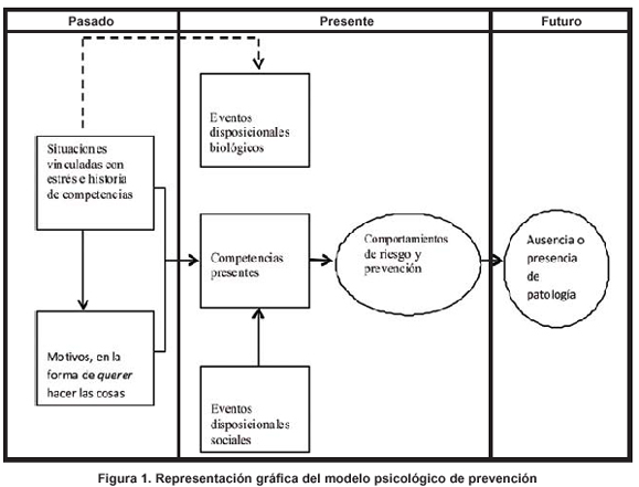 Tal es el caso del modelo psicológico de prevención de enfermedades6, cuyos elementos se encuentran distribuidos en tres fases (Figura 1): en la del pasado se tienen a las situaciones vinculadas con estrés, a la historia de competencias y a los motivos. Las situaciones vinculadas con estrés guardan correspondencia con lo que se conoce en la literatura como personalidad7, definida como modos consistentes de interacción con los que una persona entra en contacto con situaciones en las que no se prescribe un criterio acerca de qué y cómo comportarse; un ejemplo lo constituye la situación conocida como tendencia al riesgo, en donde una persona enfrenta dos situaciones o dos circunstancias dentro de una misma situación en las que existe cierta probabilidad de obtener consecuencias positivas inmediatas (placer sexual) o consecuencias positivas en el mediano o largo plazo (evitar el diagnóstico de una ITS), optando por las primeras cuando aparentan ser mayores en probabilidad y/o magnitud. Las competencias pasadas se identifican con los saberes y habilidades adquiridas por una persona al interactuar con situaciones en las que se prescribe el cumplimiento de determinados criterios; su papel es el de facilitar o interferir con el ejercicio instru-mental de ciertos comportamientos; incluyen, entre otras cosas, saber qué es el VIH, qué es el sida, cómo se puede prevenir la infección por el VIH, saber que el preservativo previene la infección por VIH y haberlo utilizado correcta y eficientemente en otras circunstancias al relacionarse sexualmente con una o más personas, etc.