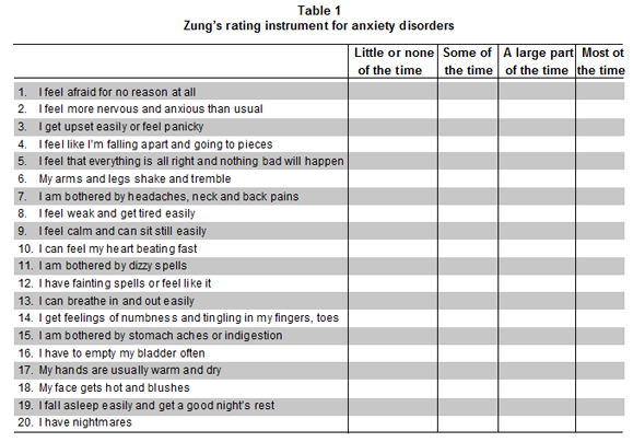 Conclusions: The 10- and 5-item version of the Zung’s rating instrument for anxiety disorders present better psychometric properties than the original 20-item version. It is necessary to estimate the properties of these versions compared with a gold standard.