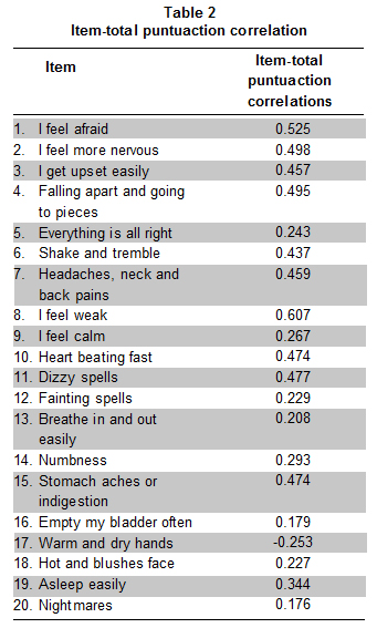 Instrument. The Zung’s rating instrument for anxiety disorders is a 20-item scale quantifying anxiety symptoms, 15 somatic and 5 cognitive symptoms, during the last month. This scale presents a Likert pattern of answer. It has four options: little or none of the time, some of the time, a large part of the time and most of the time. Each point gives punctuation between one and four, 50% in direct and 50% in reversed score. Then, total punctuation could be found between 20 and 80 points. Almost ten minutes are necessary to completed correctly10. The scale appears in theTable 1.