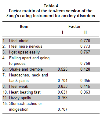 To design the new version, with ten- and five-items, of the Zung’s rating instrument for anxiety disorders were followed same criteria used for 20-item version. Pearson item-total corrected correlations, factor matrix correlation and Cronbach alpha were estimate for each new version.