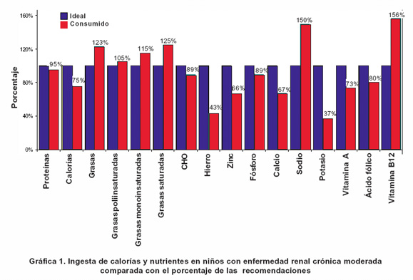 Conclusiones: Se pudo determinar que la evaluación nutricional temprana es básica en el manejo y tratamiento de pacientes con ERC moderada, pues se evidenciaron deficiencias nutricionales desde el comienzo de la enfermedad. Es importante el consumo de por lo menos 100% de las recomendaciones de calorías y otros nutrientes en niños con ERC para evitar el retardo en el crecimiento y otras alteraciones.