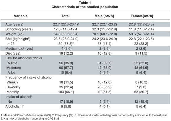 Characteristics of the target population. The mean age of the 78 polled men was not different from that of the women (p=0.84). The proportion of subjects with incomplete primary studies was 1.3% and that of subjects with a secondary education (11 years of schooling) was 26.3%. Only 52% of the subjects were at some level of university education and 2% had finished their higher education. The mean starting age in AC was 15.7 (CI 95%; 15.2 to 16.2), a year later for women (p=0.01). The age of the first occurrence of alcohol intoxication was a year after starting AC, with the difference between the sexes remaining constant (p=0.02). 11% of the population stated that they had not consumed any alcohol during the last year. Men have 1.7 more probabilities of being overweight and four times more probabilities of consuming alcohol every two weeks than women.