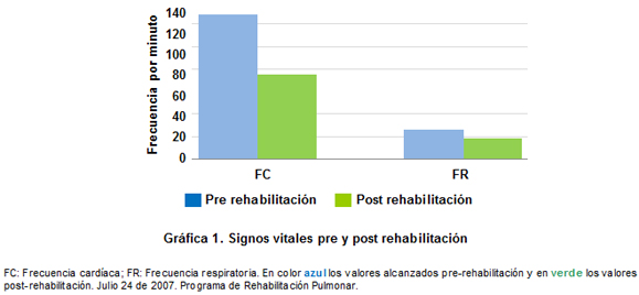 Ando et al.4 compararon los efectos de un programa de rehabilitación de nueve semanas de intervención en individuos con EPOC y en sujetos con secuelas de Tb y encontraron que no hubo cambios significativos en el VEF1 después de la rehabilitación en ambos grupos, pero si evidenciaron mejoría en la disnea medida con la MRC en las AVD y en la distancia recorrida en la prueba de caminata 42 m en pacientes con Tb y 47 m en pacientes con EPOC (p<0.01) datos que concuerdan con este informe donde la distancia recorrida en 6 min aumentó de 240 m a 350 m (110 m), pese a que no alcanzó el predicho de 740 m calculado con la fórmula de Enrigth. La frecuencia respiratoria y la frecuencia cardíaca disminuyeron al finalizar el programa de rehabilitación (Gráfica 1). Al determinar la magnitud de los cambios y las características en este paciente, luego del programa de rehabilitación pulmonar, se encontró que hubo mejoría en la percepción de la disnea medida con la escala de la MRC, de 4 a 1 (4: muy grave; 1: leve) y con la escala de Borg mejoró de 7 a 0. La necesidad de oxígeno se re-evaluó al finalizar la rehabilitación y se observó mejoría, pues pudo permanecer en estado de reposo sin soporte de oxigeno manteniendo SpO2mayor de 89% y siendo posible la disminución de la FIO2de 5 a 1 litros/m durante las AVD. La fuerza global en la musculatura de los miembros superiores e inferiores aumentó de grado 3 a 4, según la escala de Daniels, que va desde el grado 0 al 5 (3 el movimiento puede vencer la acción a la gravedad y grado 4 movimiento en contra de la gravedad con resistencia parcial).