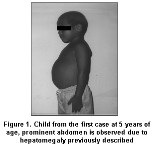 His illness began at 18 months of age with abdominal distension, aqueous diarrhea with a month and a half evolution, generalized weakness, and progressive edema on face and feet, and paleness of the skin and mucous membranes. Important antecedents: product of the first pregnancy of non-consanguineous parents, mother G2 P2 A0 C1, normal vaginal birth, pregnancy free of complications, and normal apgar at birth. His psychomotor development was normal; was breast fed by his mother until he was two years old. There is no history of epileptic crises. The physical exam found: diffuse hepatomegaly without pain 2 cm below the right costal and anasarca (extreme generalized edema) flange. A neurological exam proved normal. At this age, the patient was subjected to hepatic tests, as well as lab exams for cholesterol, triglycerides, and uric acid; all were found within the upper normal limit. No data on hypoglycemia are presented, the Beneditt and Seliwanoff tests were positive, while tests for mucopolysaccharidosis resulted negative. Gammography and hepatic ultrasound tests revealed diffuse hepatomegaly. Renal ultrasound did not show alterations. Symptoms remitted at 5 years of age (Figure 2).
