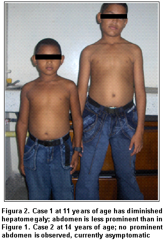 During physical exam, patients tend to have fat cheeks, thin extremities, short height, and protuberant abdomen due to massive hepatomegaly3,4. Although the phenotype of the patients does not correspond to what has been described, it can be noted that both are short for their ages, and with the first case revealing affectation to osseous age. The kidneys also show increase in size, as with the child in the case where nephromegaly was detected via ultrasound at 5 years of age; while the spleen and the heart are normal.