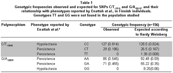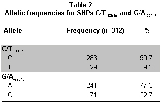 Results: Genotypic frequencies were CC (81.4%), CT (18.6%), and TT (0%) for the C/T-13910 polymorphism. Frequencies were AA (55.5%), GA (45.5%), and GG (0%) for the G/A-22018 polymorphism. No linkage disequilibrium was found between the two loci. Only the locus containing the C/T-13910 polymorphism was found in Hardy Weinberg equilibrium.