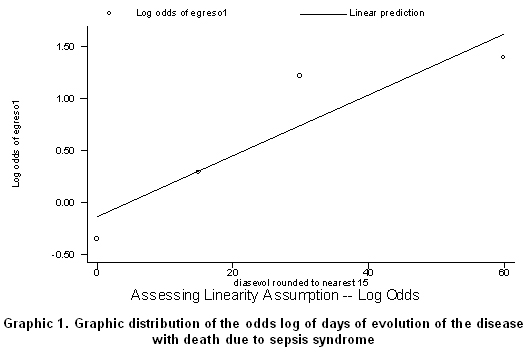 As in most medical situations, it must be stressed upon the community and upon healthcare personnel about the measures to prevent the development of sepsis: the importance of early consultation and diagnosis of every infectious process for the rapid identification of the bacteria, virus, or fungus, which permits the opportune instauration of specific treatment and, according to the severity, remission to a higher healthcare level, controlling the whole chain of inflammatory response, which if not interrupted, may lead children to a state of greater risk upon their lives7,8. Frequently, this opportunity is affected by difficulties in being seen at in healthcare centers and/or delays in consulting from the parents or legal guardians, which leads to many hours or days transpiring since the start of the process, overshadowing the prognosis9. Carrillo et al.1, reported that chronic malnutrition, deficient medical services, inadequate use of antimicrobial medications and late remission to level three attention, contribute to the development of sepsis and septic shock. In this study, we found that greater number of days of evolution of the disease increases the risk of dying due to sepsis (OR 1.05 CI 95% 1.01-1.10), with a small but significant effect (Graphic 1).