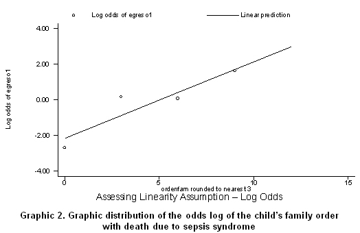 Linearity was found with the outcome variable, during hospital stay, days of evolution of the disease, and the child’s family order. Greater family order and more days of evolution of the disease indicated greater mortality (Graphics 1 and 2).