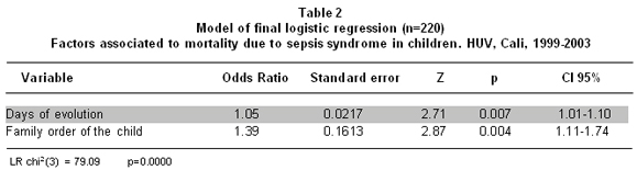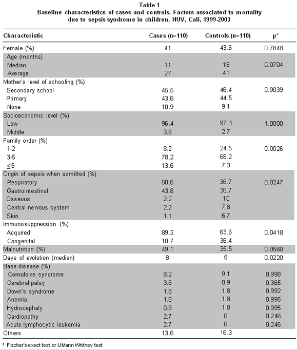 Methods: We performed an analytical study of cases and controls, which included patients between 31 days and 14 years of age, treated at Hospital Universitario del Valle in Cali, Colombia, with sepsis syndrome between 1999 and 2003. Information was gathered from medical records and books. The outcome variable was the status on discharge from hospital (alive or dead). All the dead children were verified in the hospital records and all the living children were confirmed alive four weeks after discharge. The exposure control variables were age, gender, origin, socioeconomic status, educational level of mothers, family order of the child, classification and origin of sepsis, nutritional status, underlying disease, presence and type of immunosuppression, invasive procedures, duration of surgery, broad-spectrum antibiotics, as well as preoperative, hospital and intensive care stay.