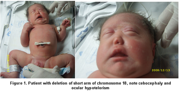 Introduction: The syndrome by deletion of the short arm of chromosome 18 is an infrequent syndrome, and its phenotypical variability makes it difficult to recognize. Its most frequently observed clinical characteristics include mental retardation, growth retardation, craniofacial malformations, including long ears, microcephaly and short neck; other less frequent associated malformations include holoprosencephaly.
