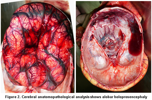 Paraclinical findings. Simple cerebral scan revealed a single ventricle, fused thalamus; findings compatible with alobar holoprosencephaly, echocardiogram: normal and renal ultrasound: normal. Cytogenetic findings (g-banding karyotype, 750-band resolution): 46, XX, of (18)(p11.2). The patient died one day after birth, with the anatopathological exam revealing the findings reported by the ultrasound and scan (Figure 2).