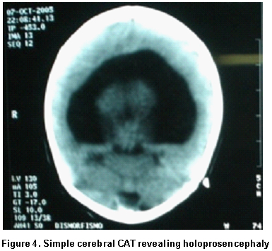 We present a female newborn, offspring of a primigest 17-year-old mother. Prenatal ultrasound was performed during the first, second, and third trimesters; the first two revealed no alterations and the third showed evidence of asymmetry of the ventricular system. The birth took place at Hospital Universitario del Valle in the city of Cali, with an Apgar score of 8 and 9 on the first and fifth minute; placenta, umbilical cord and blood vessels without alteration, Ballard GA of 38 weeks, weight: 2200 g (p=5), height: 47 cm (p=10), head circumference: 28 cm (p=5), distance between inner edges: 15 mm (p<3), distance between outer edges: 58 mm (p=3-25). The physical exam found fused sutures, posterior and anterior fontanelle <1 cm, rounded face, sinophris, ocular hypotelorism, cebocephaly, single nostril, micrognathia, flat osseous palate, and pectus excavatum (Figure 3).