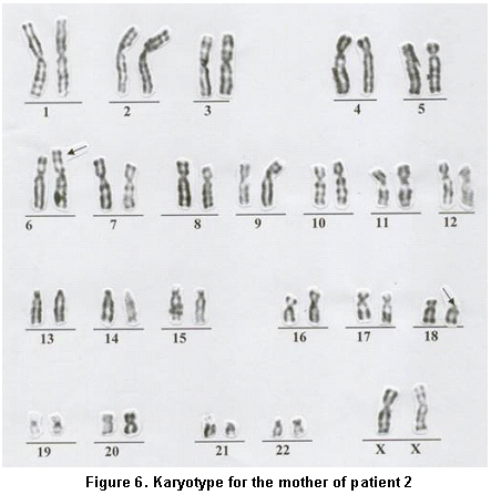 Paraclinical findings. Simple cerebral scan revealed a sole ventricle, fused thalamus, without evidence of structures in the medial line; alobar holoprosencephaly is concluded (Figure 4), echocardiogram: normal, renal ultrasound: normal. Cytogenetic findings (g-banding karyotype, 750-band resolution): 46, XX, of (18)(p11.2) see Figure 5, in the Karyotype the mother was found 46, XX, t (6p, 18p) (18pter’™18p11.2: 6p24’™6qter), der. 18 (Figure 6).