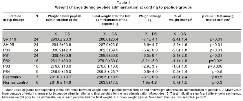 To determine if the effect of the peptides on weight change was statistically different, we used the ANOVA and Duncan tests. We tested to see if there were differences among peptide groups (ANOVA: p<0.00009): groups SR116, SH95, P80, and P81 presented weight reduction similar among them and greater than the change observed in groups P82, P83, and P84; nevertheless, the differences were statistically significant among groups P78 to P81 and the normal control and P84 groups. The weight change in group P84 was not differentiated from the change observed in the two controls or in groups 82 and 83 (Table 2).