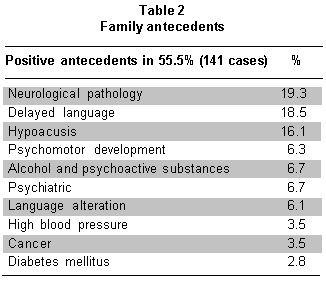 In 141 children (55.5%), some type of positive family antecedent was found (Table 2) among which it is worth remarking hearing loss, delay or other type of language alteration, psychomotor delay, and neurological pathology.