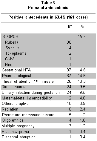 Prenatal antecedents were positive in 161 (63.4%) cases (Table 3). In these, it is important to note the frequency of infection during pregnancy by agents like rubella, syphilis, toxoplasmosis, and cytomegalovirus, which constituted 15.7% of the cases. There were 10 children with other infections not classified at the moment of doing the clinical history, among which any of the aforementioned agents may be found.