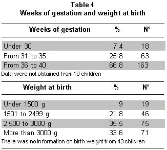 Among the perinatal antecedents, positive in 96 (37.8%) of the population studied, it was found that in 7.4% of the children under 30 weeks of gestation and 25.8% between 31 and 35 weeks, there were 3 newborns who weighed less than 1000 g. In total, 65 children were underweight at birth (Table 4).