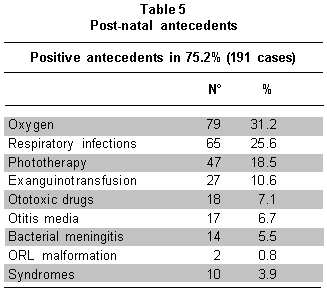 Positive post-natal antecedents were found in 191 children (75.2%) among which the highest frequency was found in oxygen requirement, phototherapy, exanguinotransfusion, upper respiratory infections, and middle-ear infections, as well as meningitis among other causes according to that observed in Table 5.