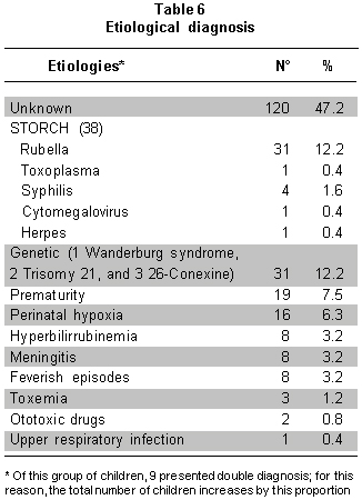Etiological diagnosis. For each patient, a causal diagnosis was done considering for each case what was the principal etiological factor for the hearing loss; nevertheless, in some cases there was concurrence of several significant etiological factors that were included in the definite diagnosis (Table 6).