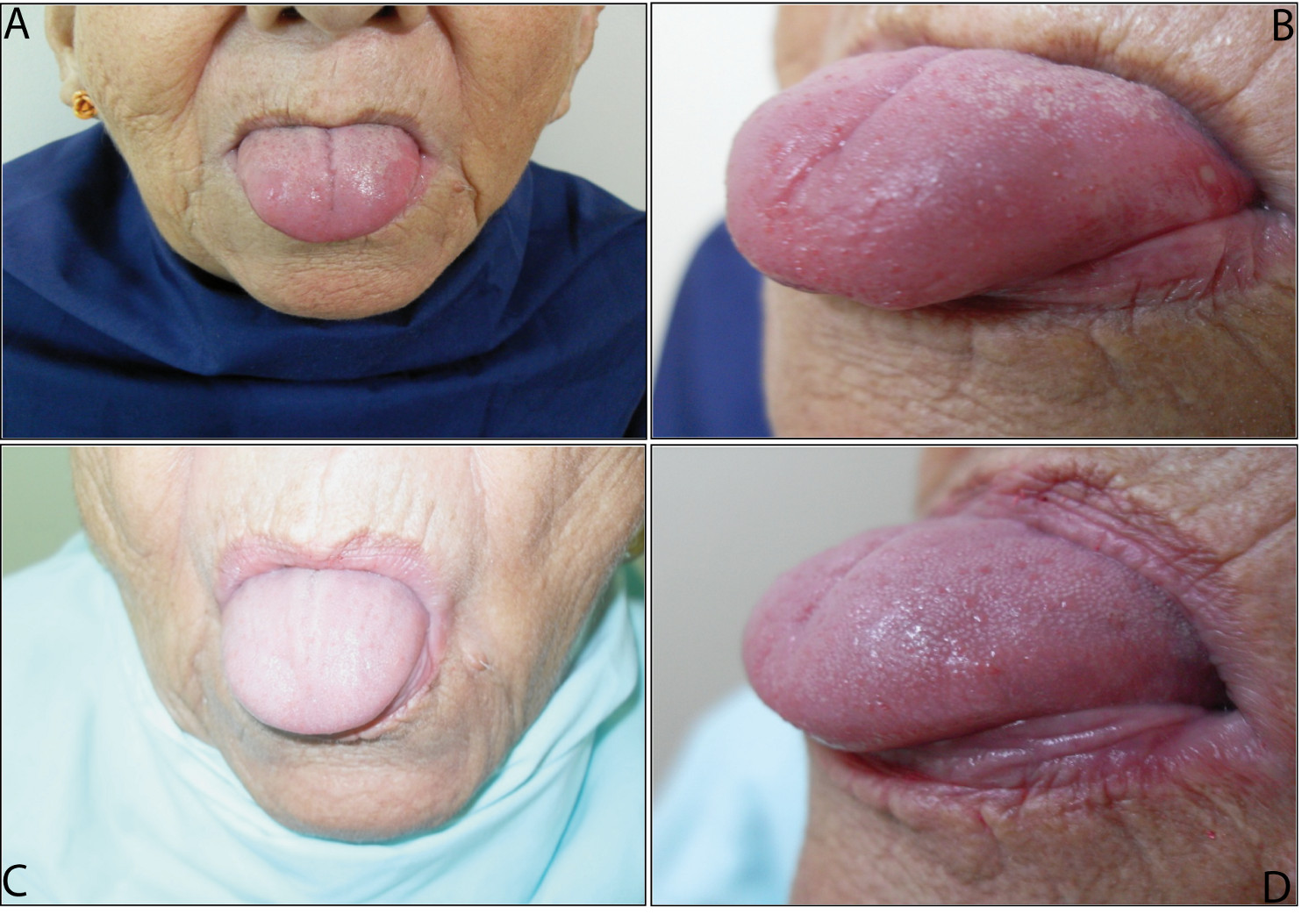 Upon physical exam for admission, she was in poor general state, pale, and marked loss of muscle mass. Blood pressure was 130/80 mm/Hg, without orthostasis, respiratory rate 17 per min and heart rate 85 per min. Her weight before developing the diseasewas 70 kg; her current weight is 60 kg, height 1.65 m. The oral cavity showed smooth, shiny, reddish depapillated tongue with ulceration at lateral level (Fig. 1 A and B).