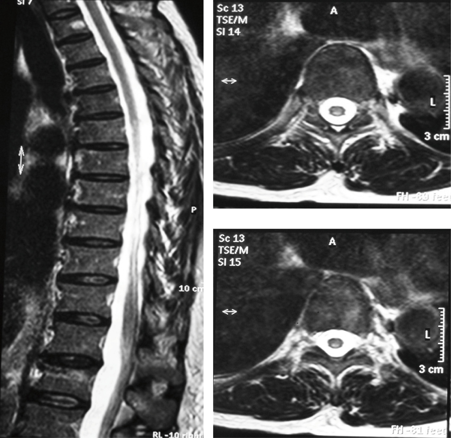 The NMR images show focal and symmetric hyperintensity in the posterior half of the spinal cord visible in T2 sequence, explained by increased water content, as illustrated in (Fig. 2). Differential diagnoses for these lesions observed under magnetic resonance include infections (tabes dorsalis, human immunodeficiency virus, and herpes Zoster), neoplasms (lymphoma, paraneoplastic myelopathy), vascular (arterial or venous ischemia, arteriovenous malformation of spinal cord), post-radiation myelitis, multiple sclerosis, acute transverse myelitis, and syringomyelia 8 .