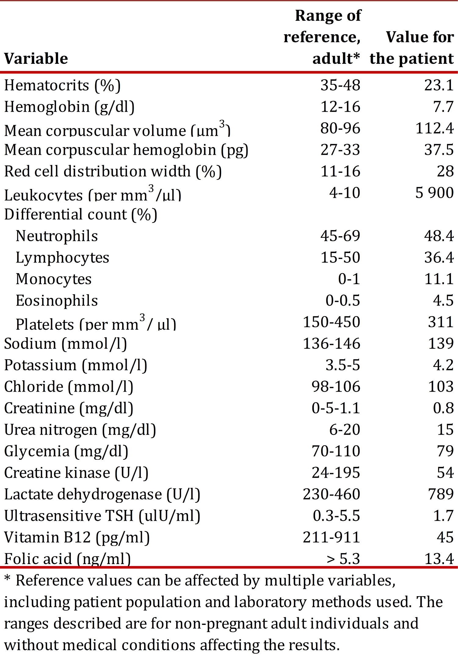 Neurological exam revealed that she was alert and oriented in all three spheres, no cranial nerve involvement, or abnormal movements. She had muscle weakness grade 3/5 and spasticity in all four limbs, tone and tropism diminished. The superficial sensitivity, touch, pain, and temperature systems were normal. Deep sensitivity was altered, with lack of vibratory sensation of the sense of position in upper and lower limbs, numbness in hands and feet, and positive Lhermitte's sign. Gait was characteristic of sensory ataxia with postural instability, broad support polygon, positive Romberg's sign, diminished osteotendinous reflexes especially in lower limbs and bilateral flexor plantar reflex present. Different para clinical studies were carried out (Table 1). Urinalysis, serology, and direct Coombs test were also performed under normality parameters. Additionally, extended blood test was conducted, revealing red cell anisocytosis, macrocytosis, and poikilocytosis. White series with hypersegmented neutrophils and platelet series without alterations were found. Upper gastrointestinal endoscopy was performed with the biopsy showing chronic atrophic gastritis positive for Helicobacter pylori.